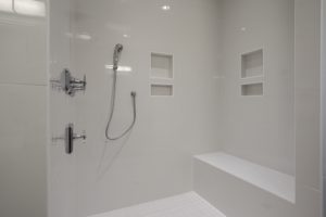 Modern,Tile,Shower,With,Built-in,Shelves,,And,Chrome,Fixtures,,Seating